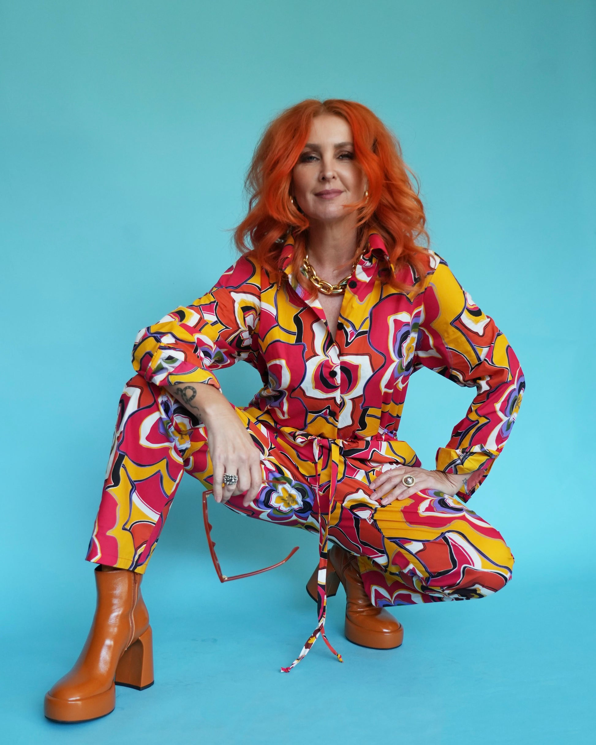 The Palm Royale Floral has been printed on our signature high quality cotton base. A bold, vibrant, colourful pattern this exclusive retro print features shades of cherry red, mustard, orange and lilac.