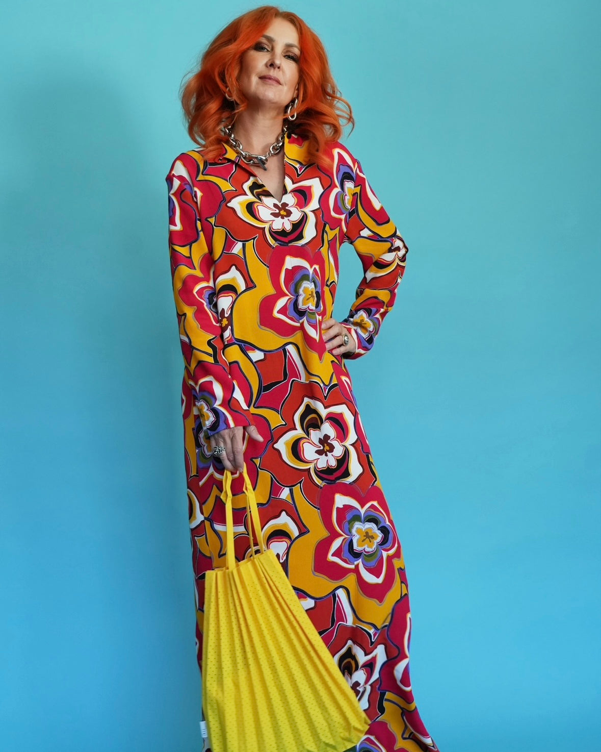 Our exclusive Palm Royale Floral has been printed on our signature soft luxury viscose crepe base with beautiful drape. A bold, vibrant, colourful pattern this exclusive retro print features shades of cherry red, mustard, orange and lilac.