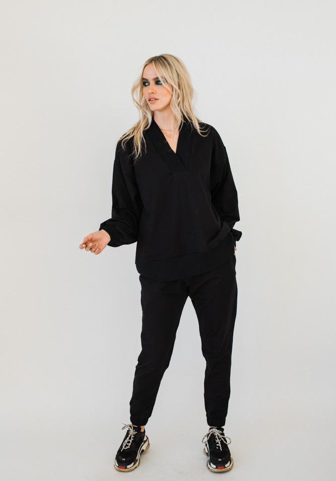 The V-neck Sweat Top is a loose fit, V neck sweater with wide ribbed neckline, cuff and hem details.