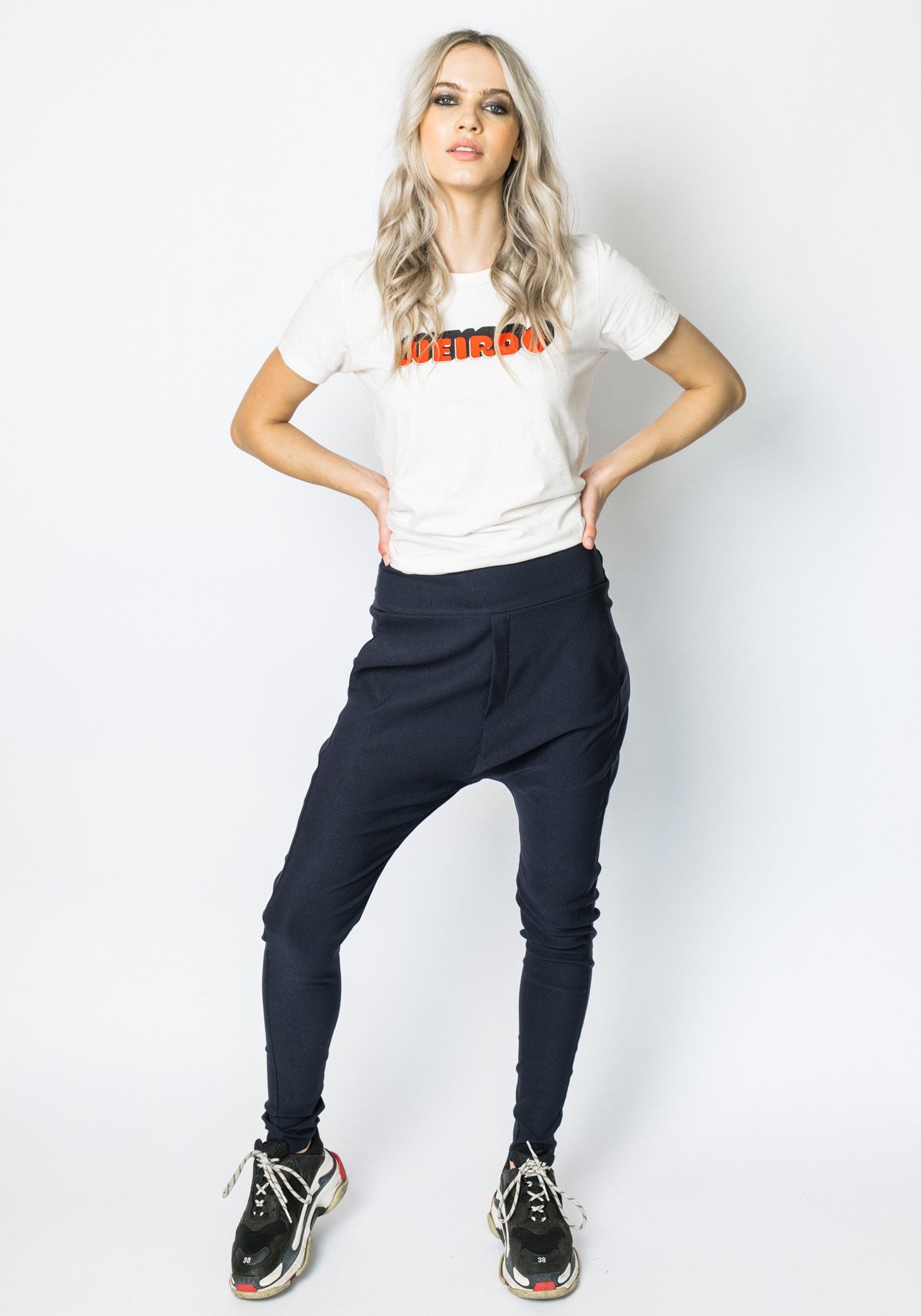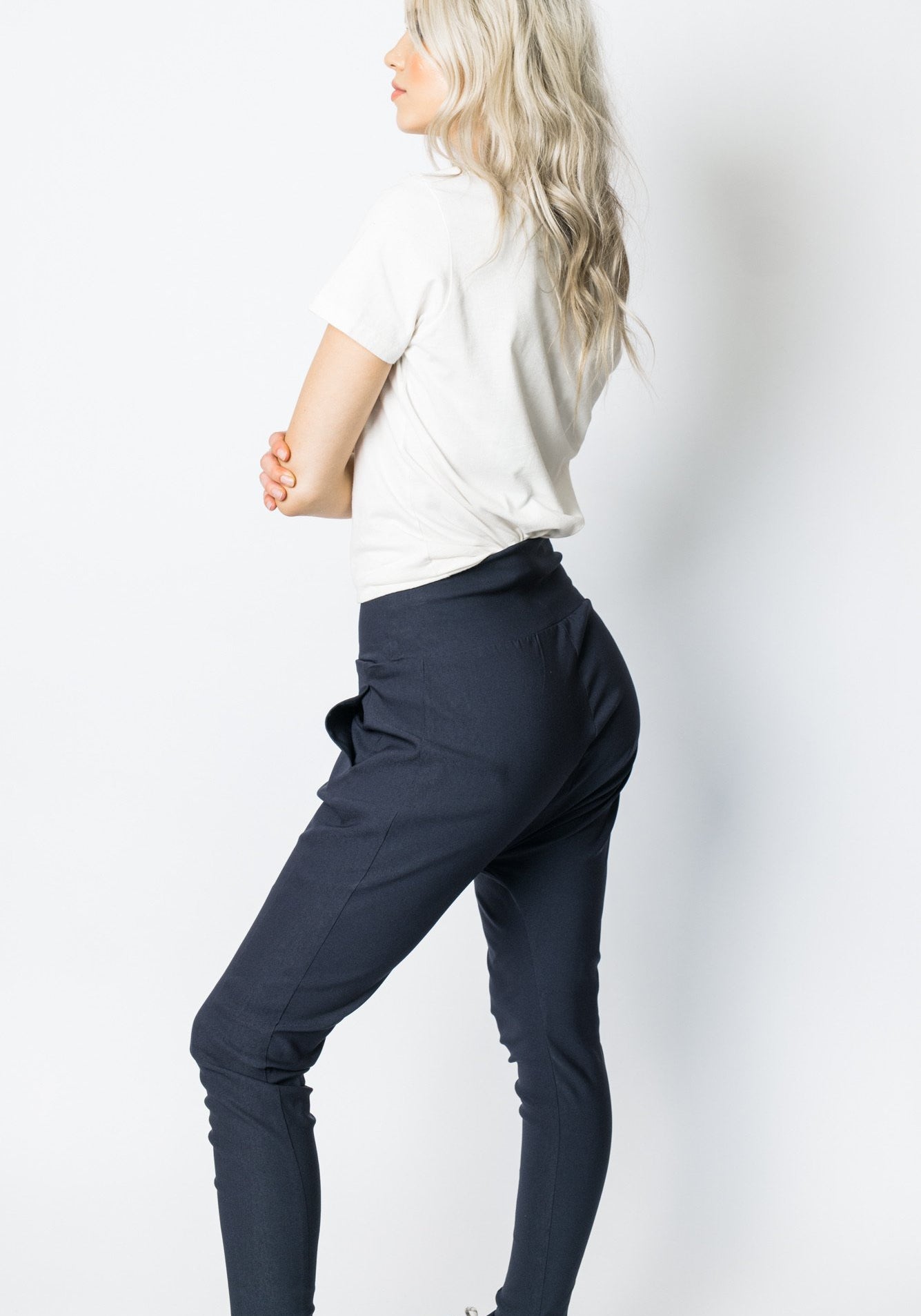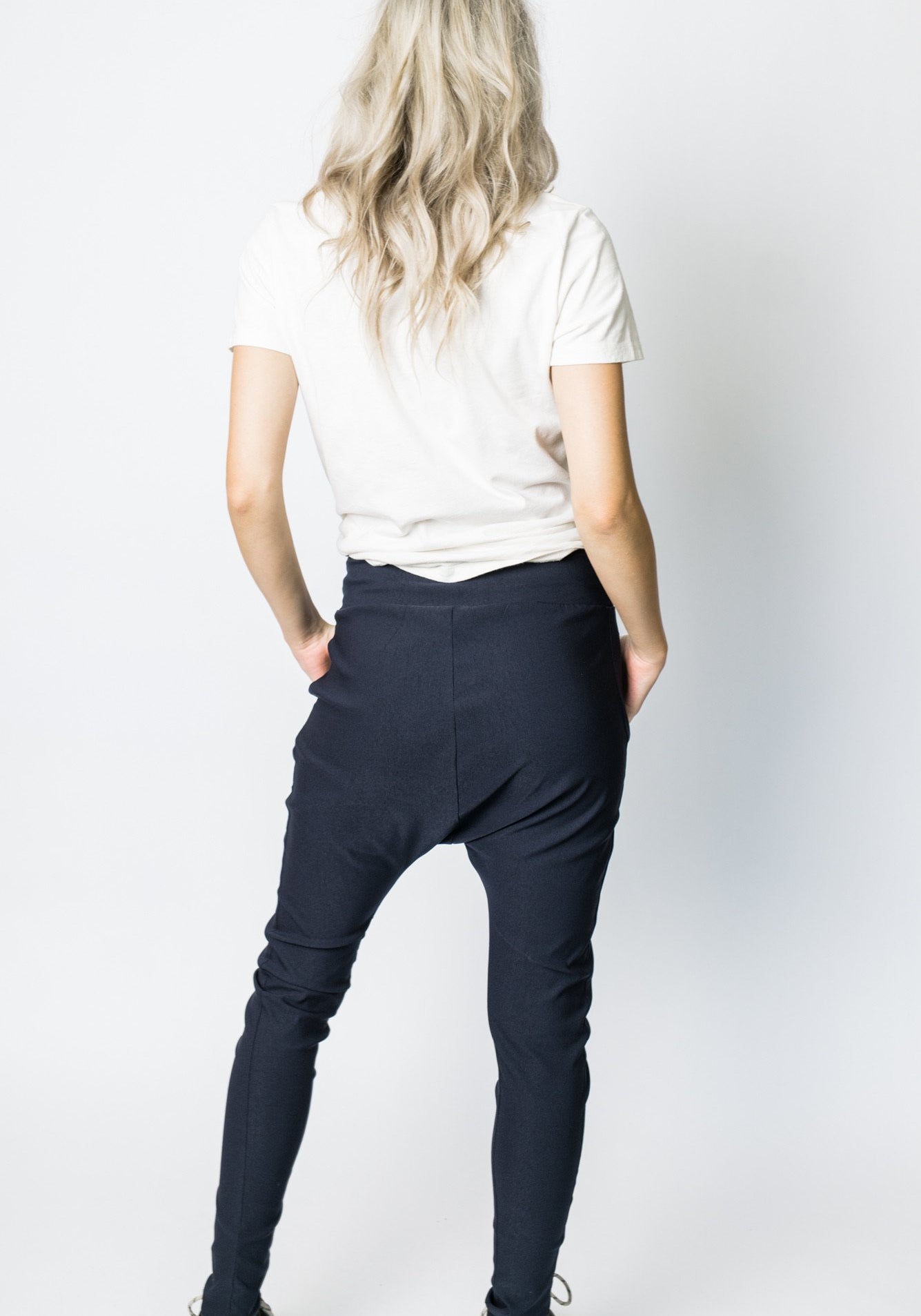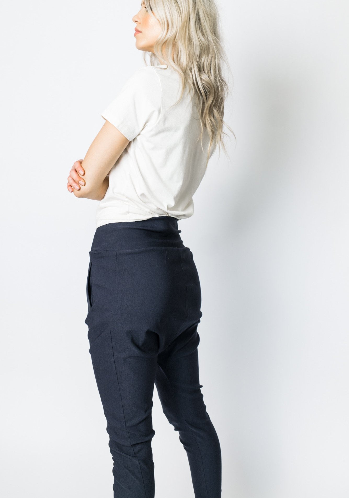 The Twill Highrise Pant is a relaxed fit, pull-on stretch pant. This pant features a drop crotch that tapers into a slim leg, faux fly and side pocket detail.