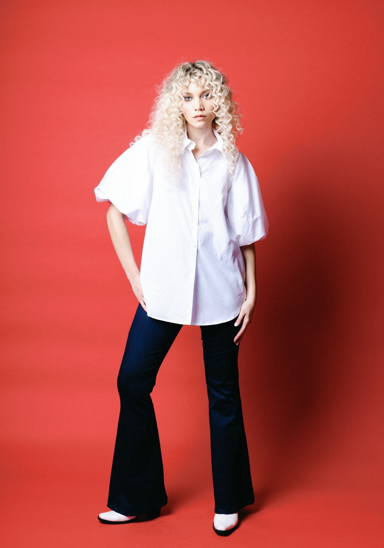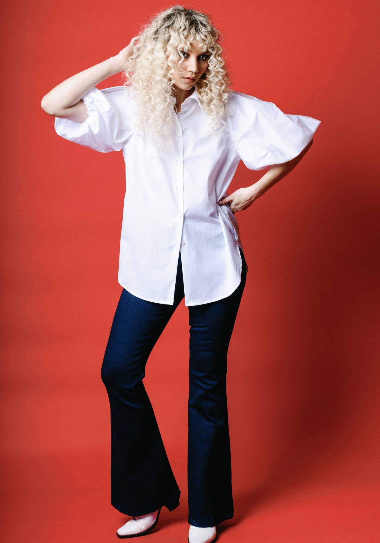 The Dolly Shirt is a button down, relaxed fit shirt with western detail, featuring a balloon sleeve.