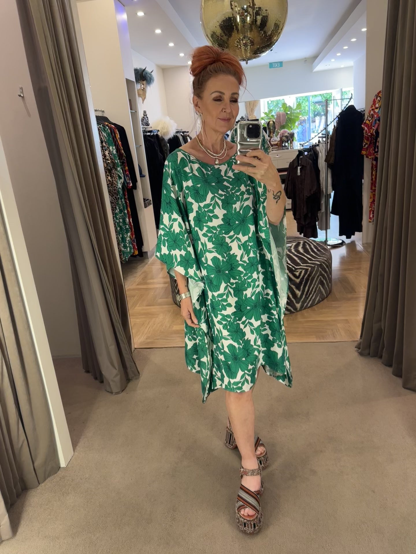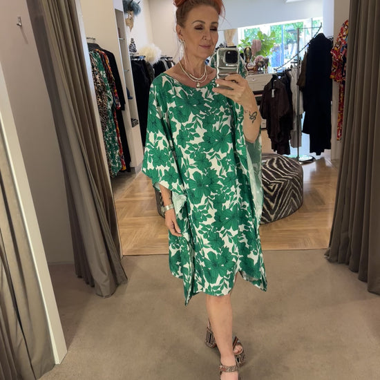 The Kaftan Mini Dress is a stunning free flowing knee-length dress featuring a flattering boat neckline and draped sleeves. Easy fit and easy to wear, this dress is a one size fits all.