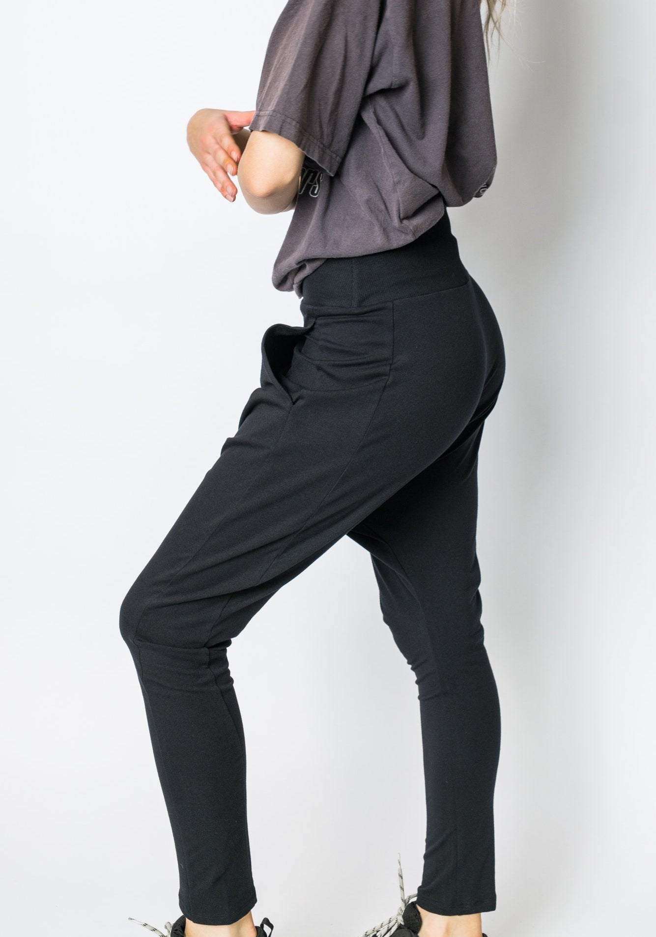 The Loose Pants are a pull-on, easy fit stretch cotton ‘track pant‘. This relaxed style features a drop crotch that tapers into a slim lower leg, a wide soft rib waistband and front pockets.