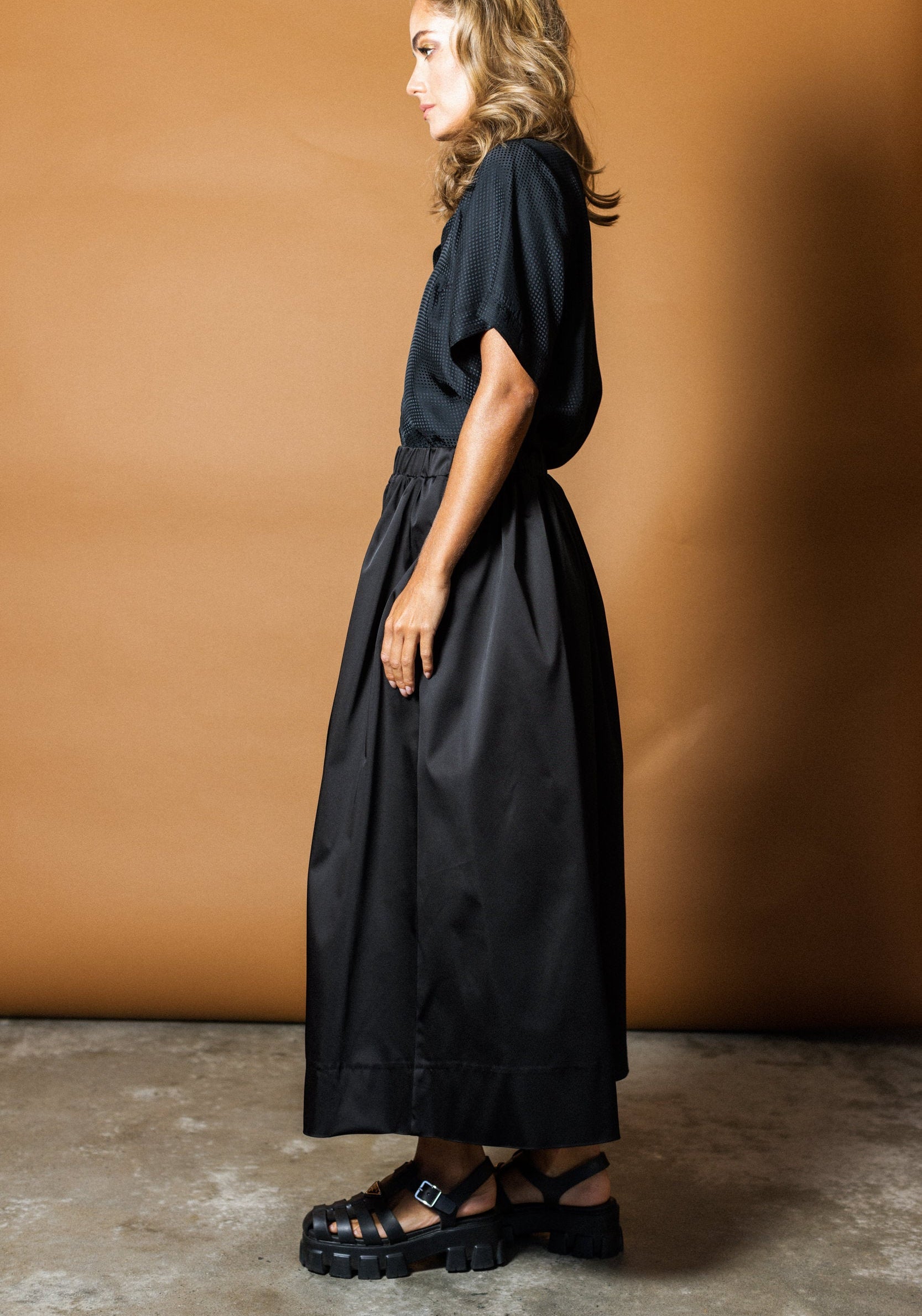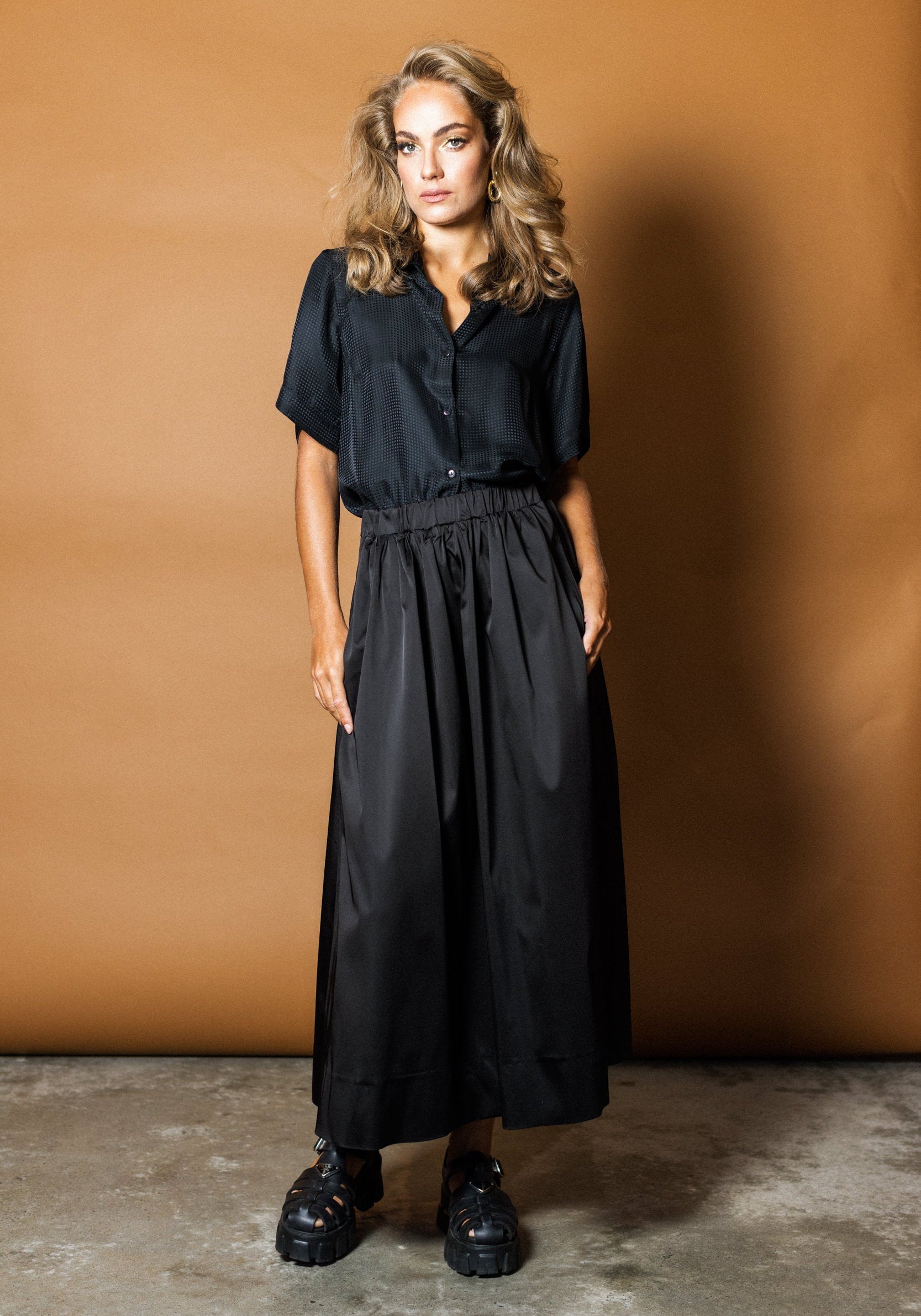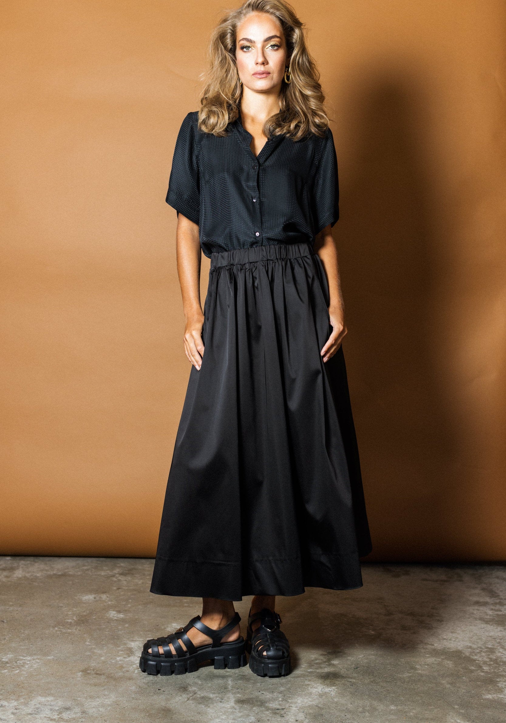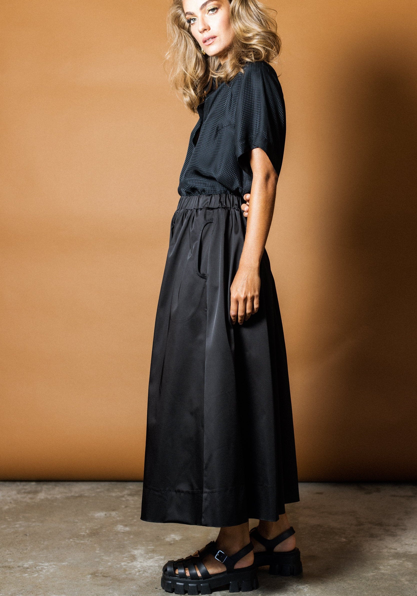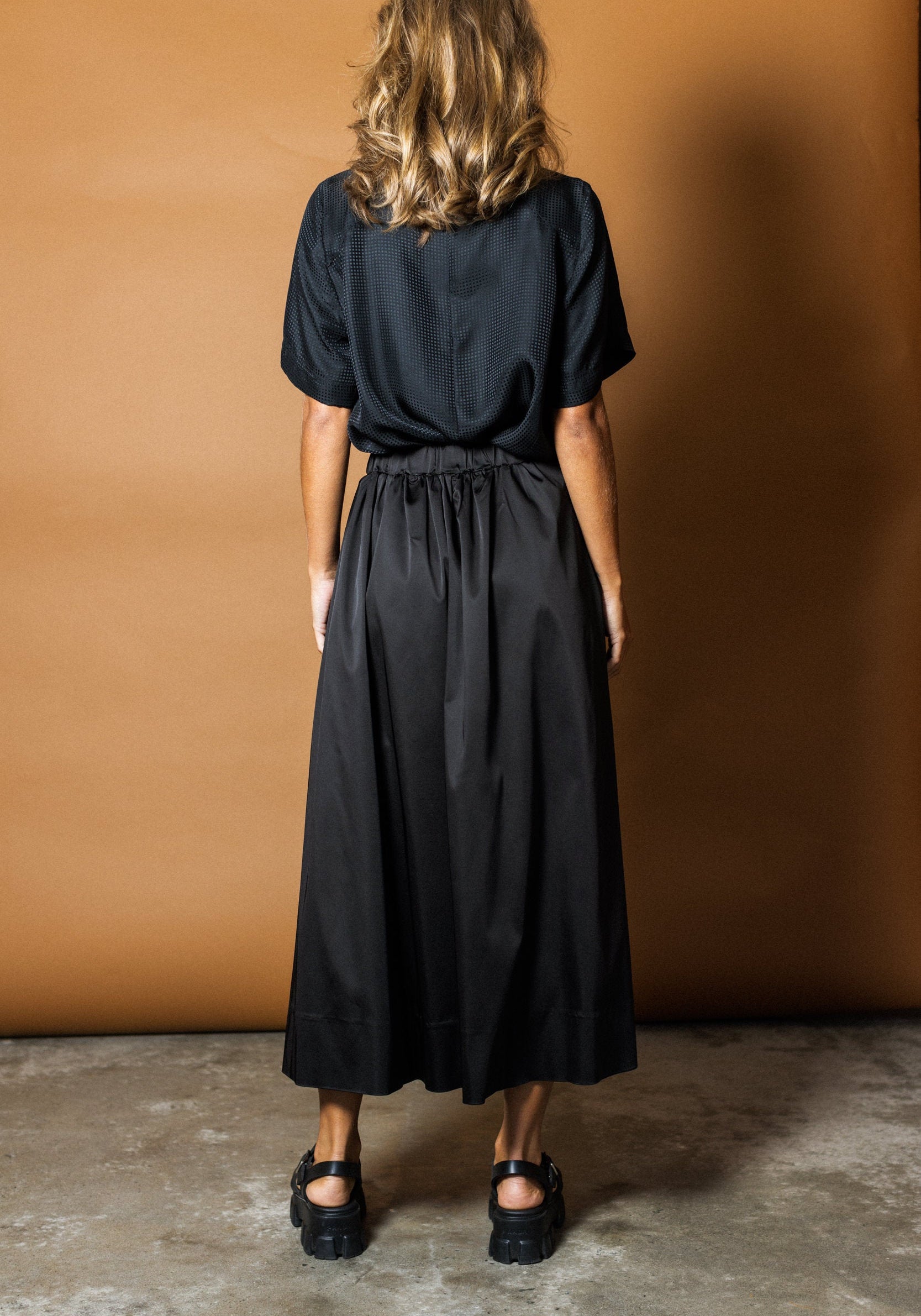An Empire Rose classic... the Luxe Full Midi Skirt is back! The Luxe Midi Skirt in Black is made from a high-gloss satin feel luxe fabric. This pull on mid length style skirt is an easy-fit, easy wear. Featuring an elasticised waistband for comfort and side pockets... the Luxe Skirt is both luxurious and versatile.