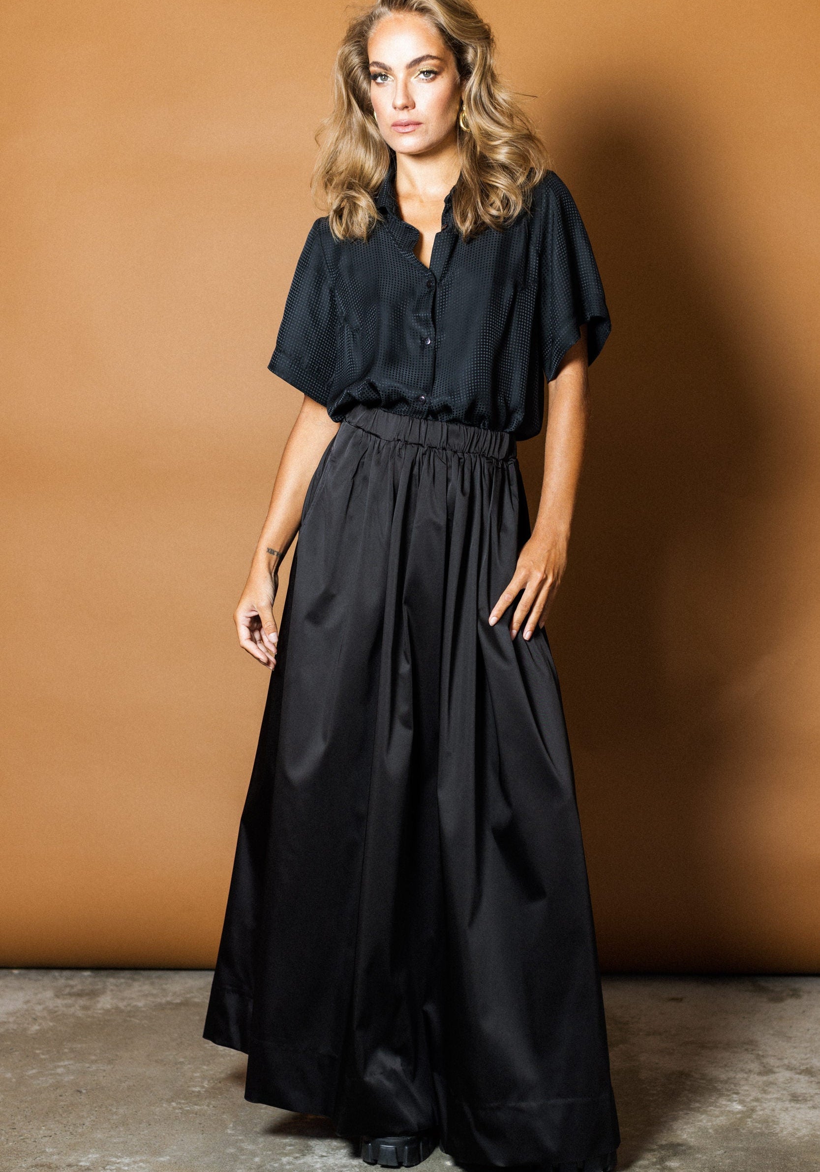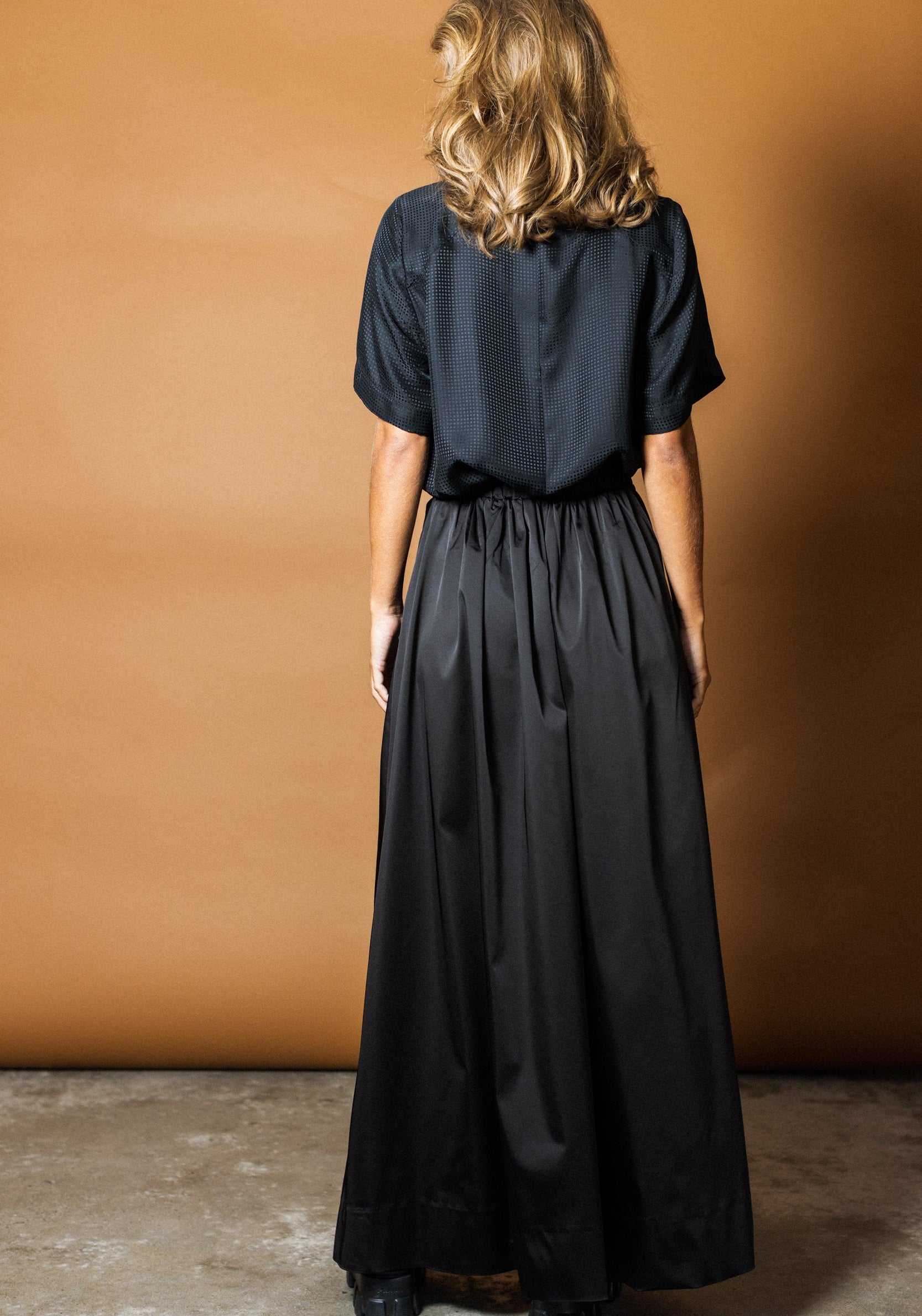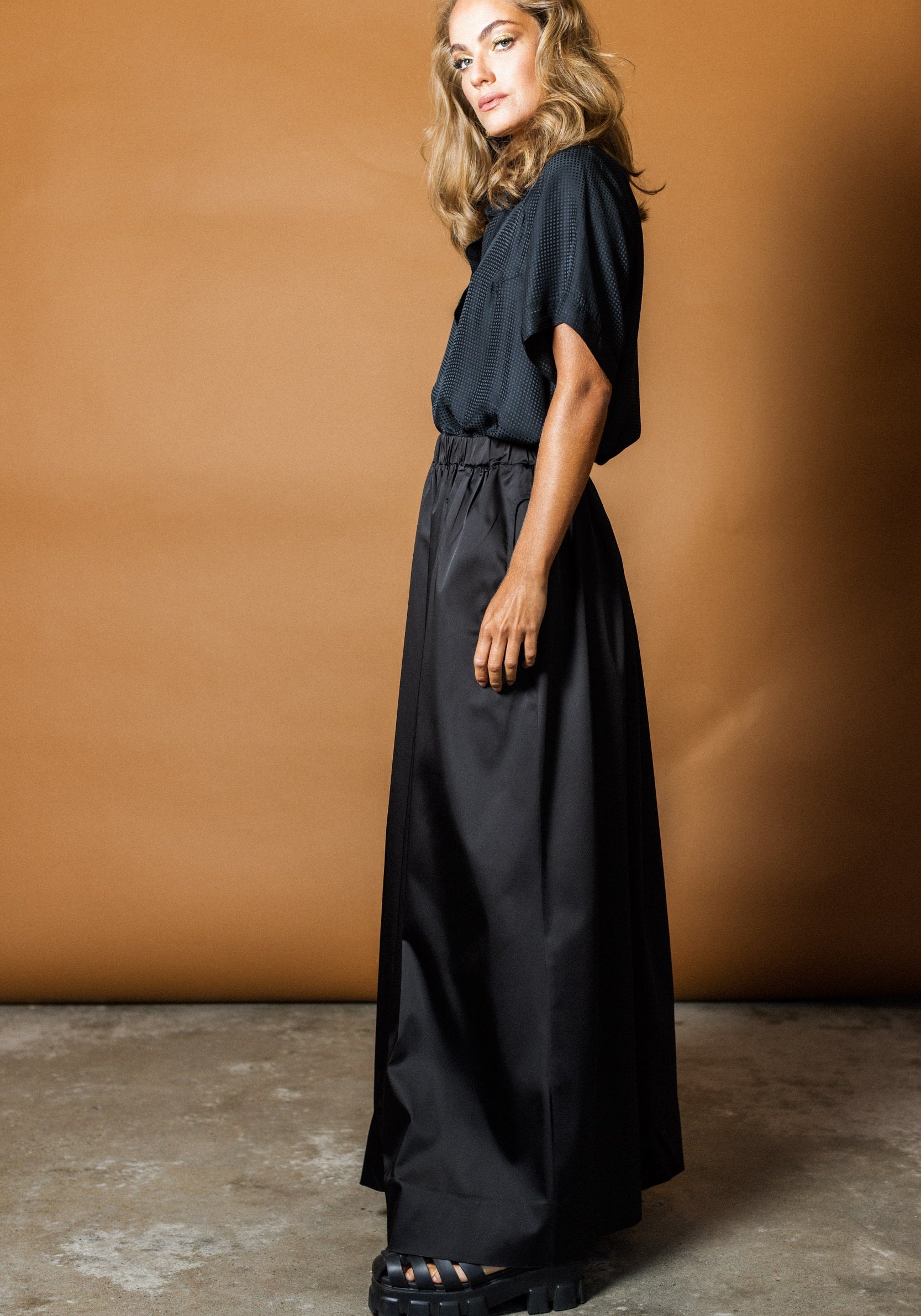 An Empire Rose classic... the Luxe Full Skirt is back! The Luxe Skirt in Black is made from a high-gloss satin feel luxe fabric. This pull on full length style skirt is an easy-fit, easy wear. Featuring an elasticised waistband for comfort and side pockets... the Luxe Skirt is both luxurious and versatile.