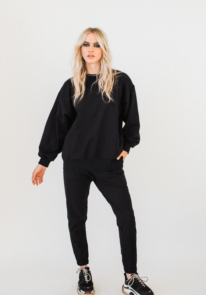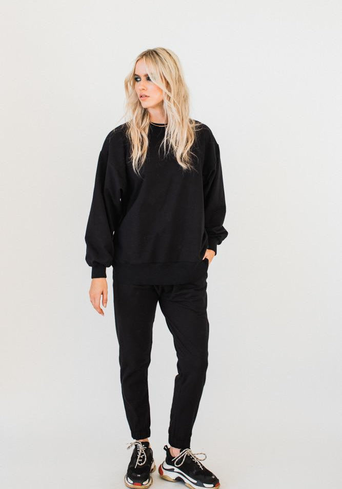 The Sweat Top is a loose fit, crew neck sweater with ribbed collar, cuff and hem details.