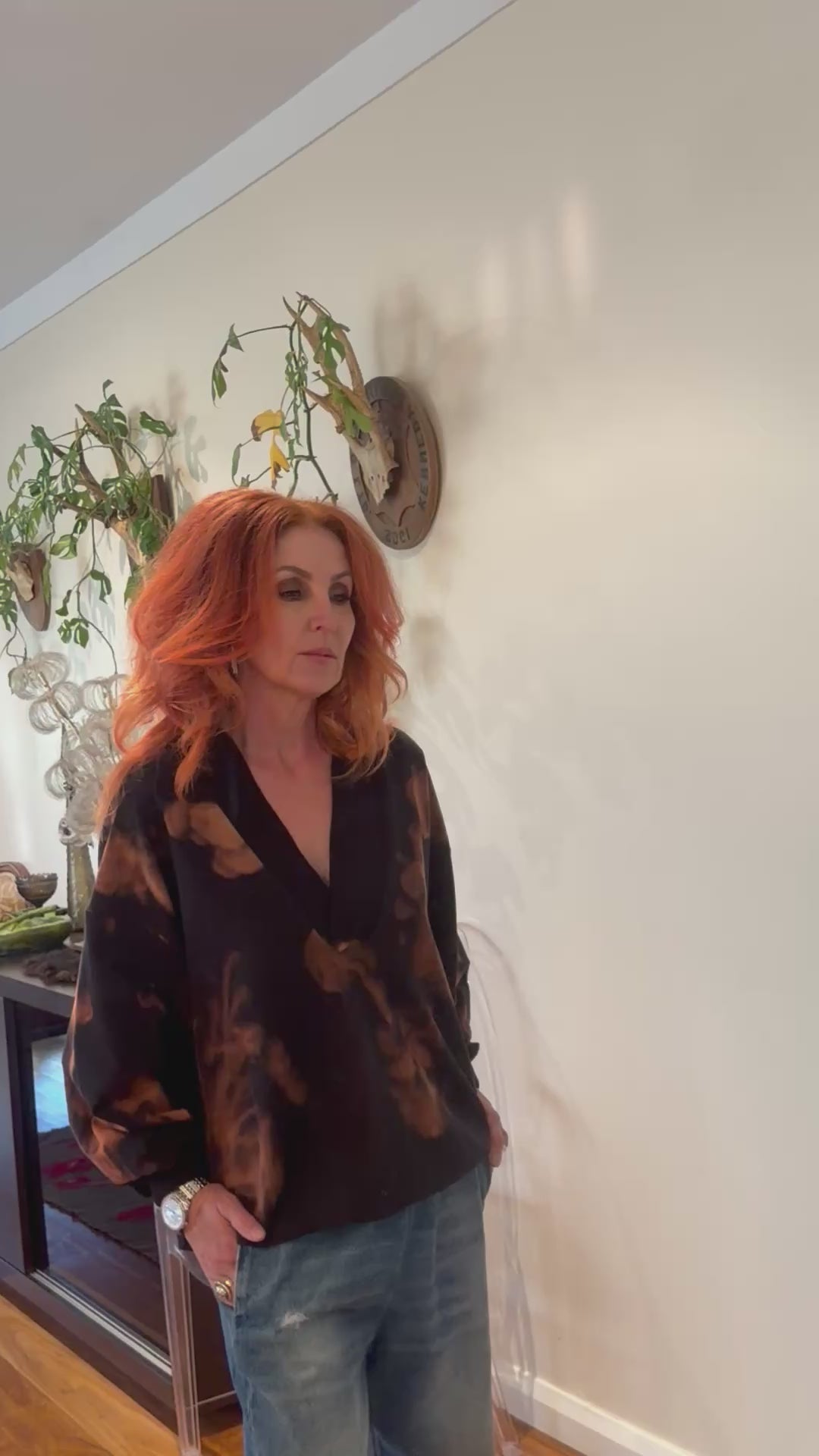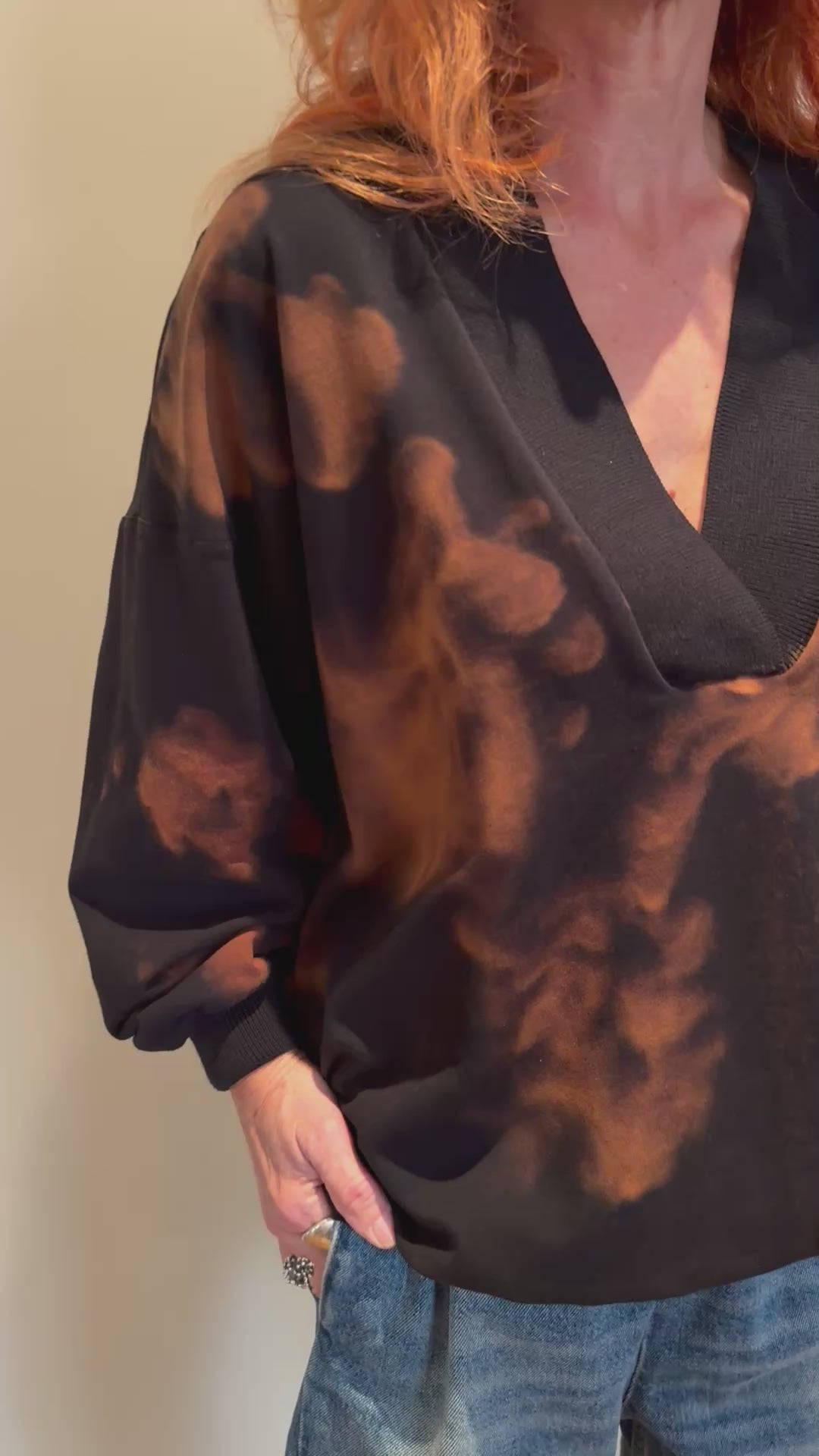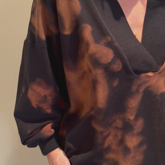 The V-neck Sweat Top is a loose fit, V neck sweater with wide ribbed neckline, cuff and hem details.