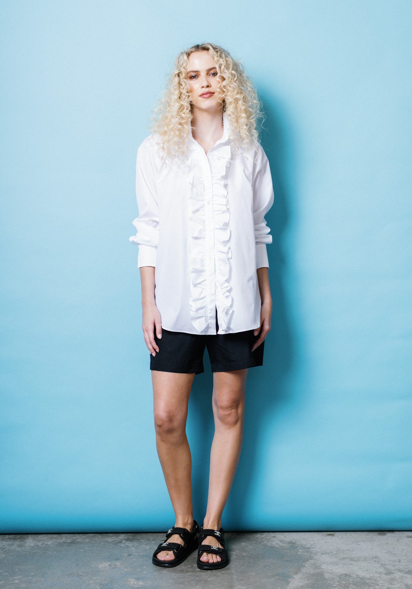 The Ruffle Shirt is a relaxed fit, button-down, long sleeve shirt featuring a ruffle front and cuff detail. Crafted from a high quality Japanese cotton.