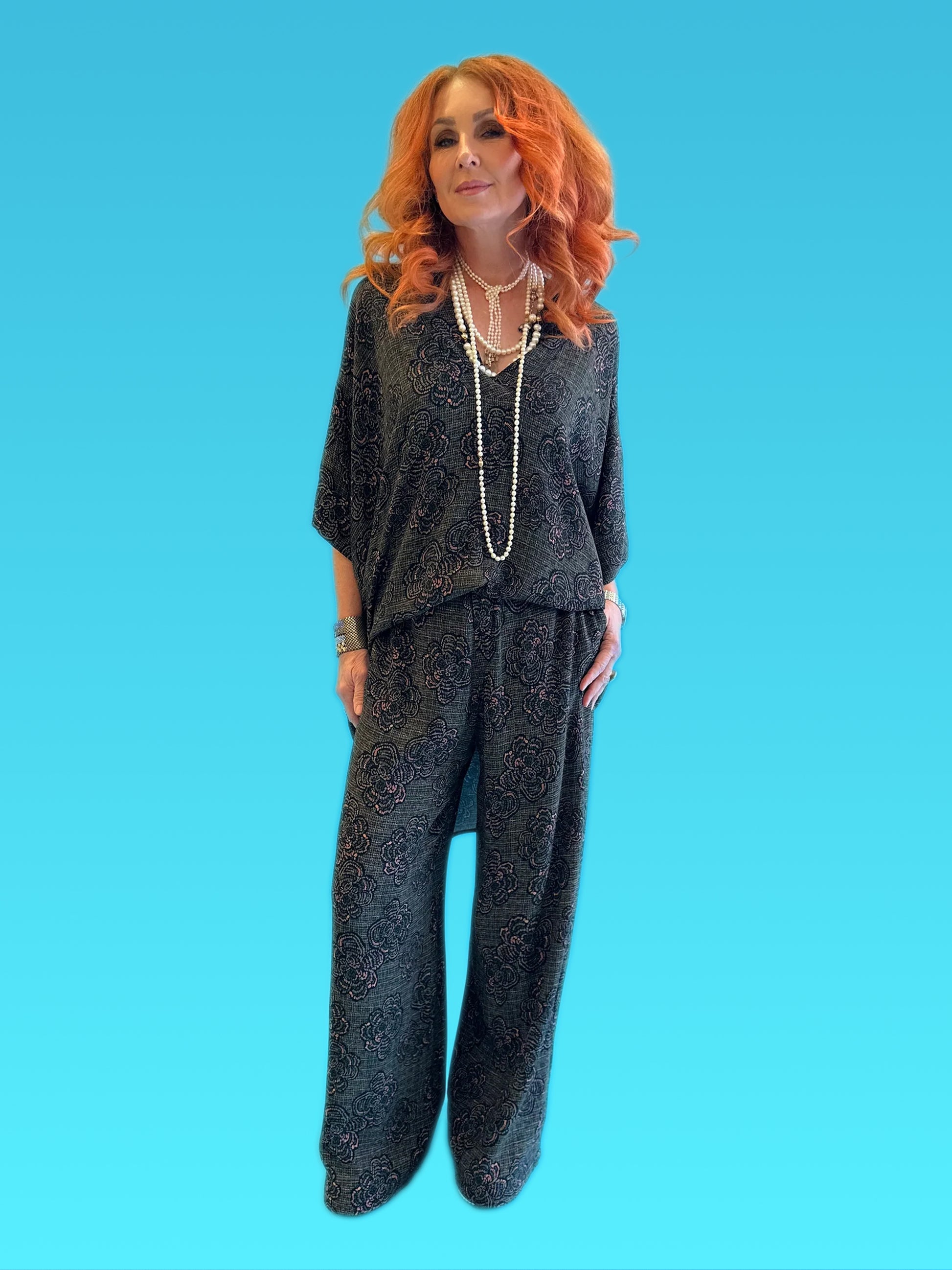 The Wide Leg Pant is a pull on pant with pockets. A relaxed, easy fit wide leg pant with a cased elastic waistband.