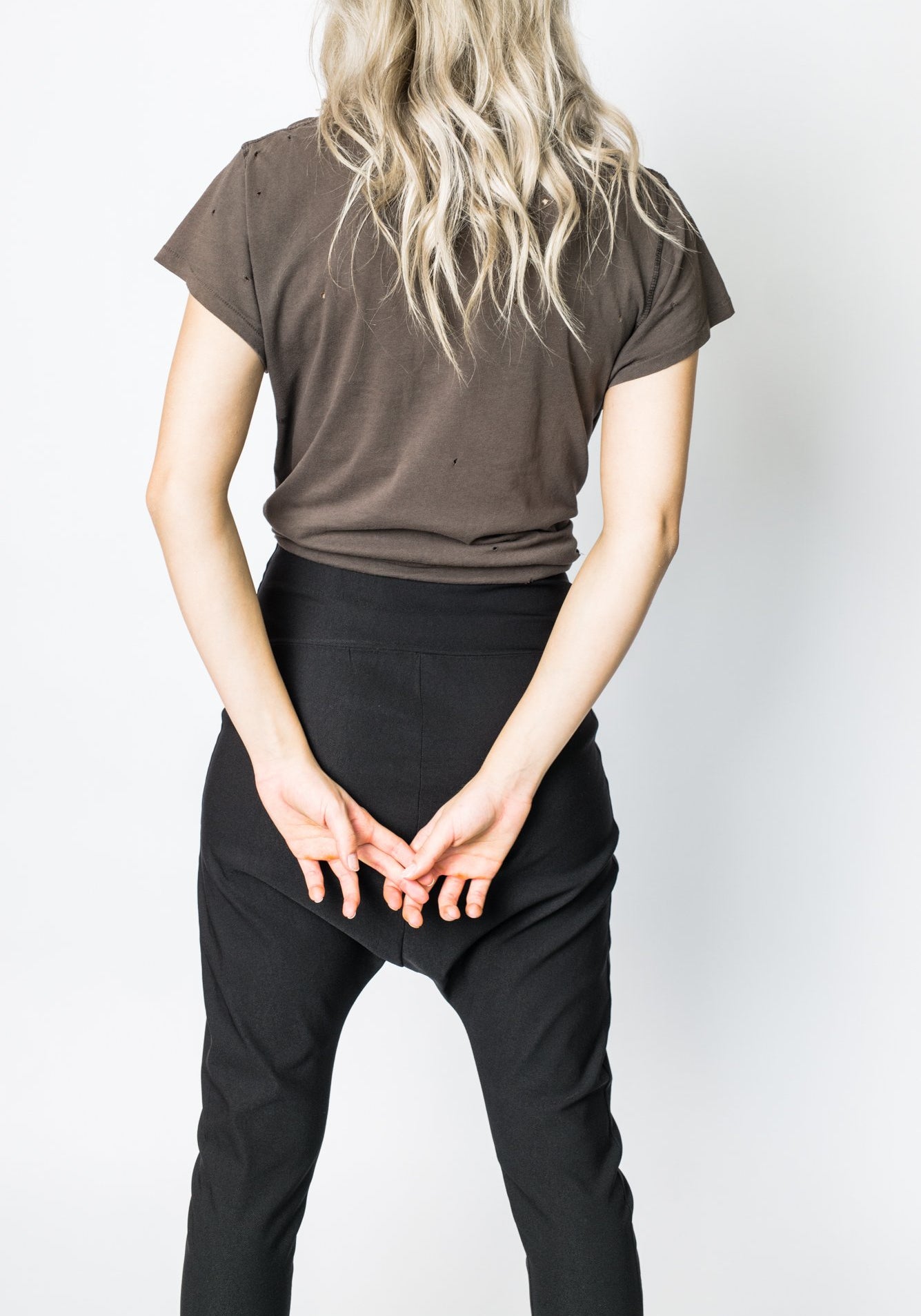 The Twill Highrise Cropped Pant is a relaxed fit, pull-on stretch pant. Our Cropped Pants are the exact same fit as our original Highrise Trainers, however they have been cropped to the ‘new look’ ankle length for an instant update. This pant features a drop crotch that tapers into a slim leg, faux fly and side pocket detail.