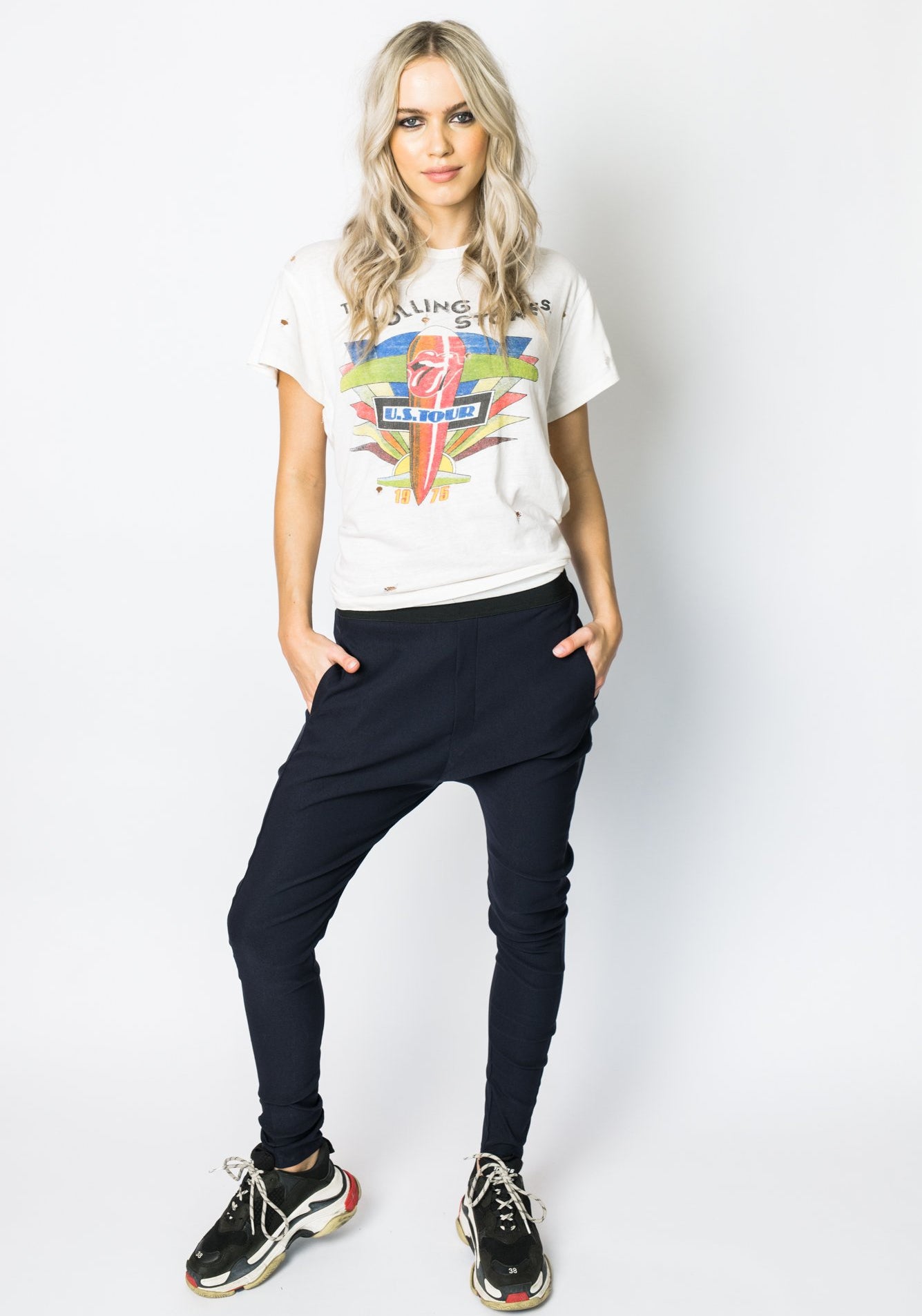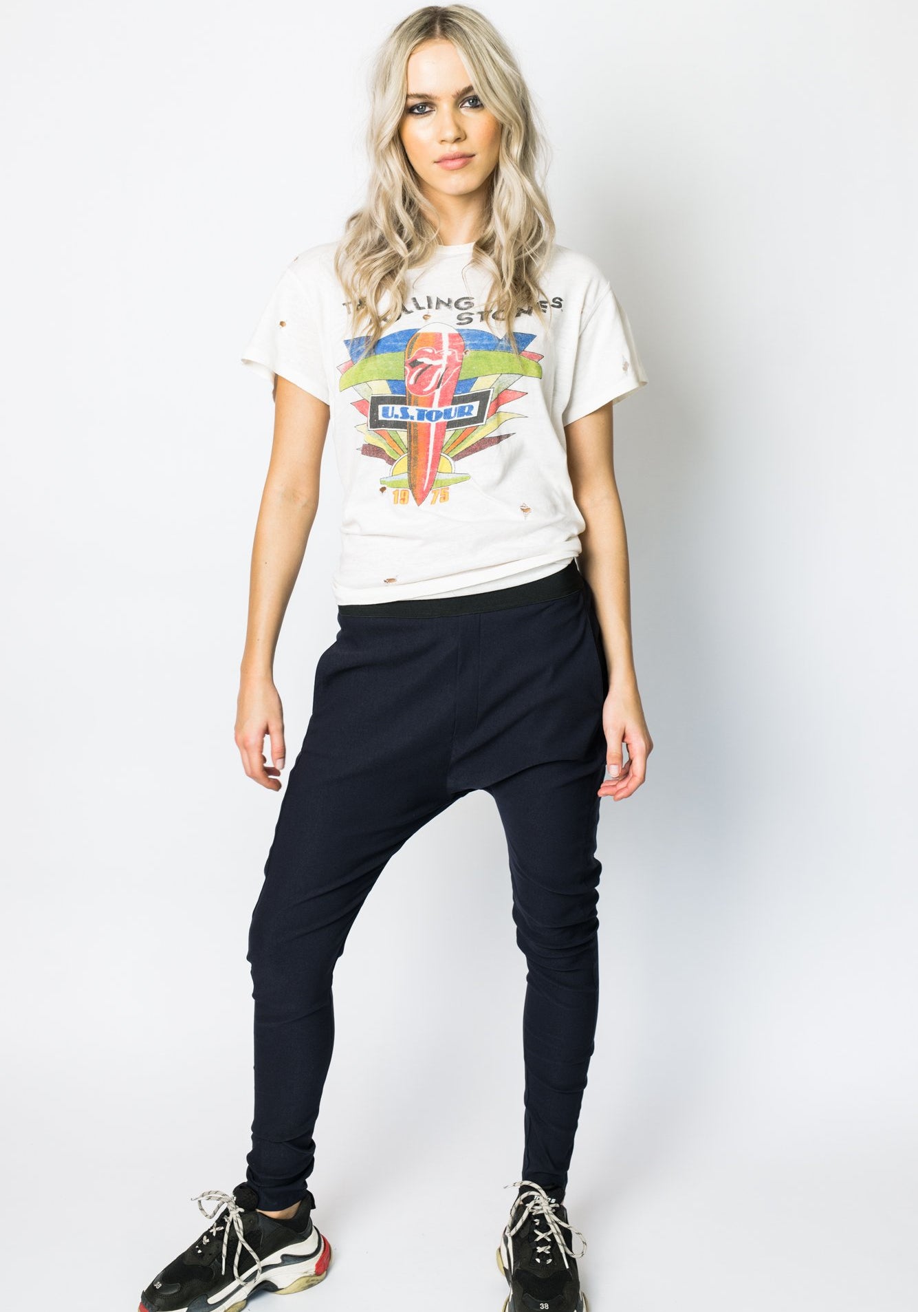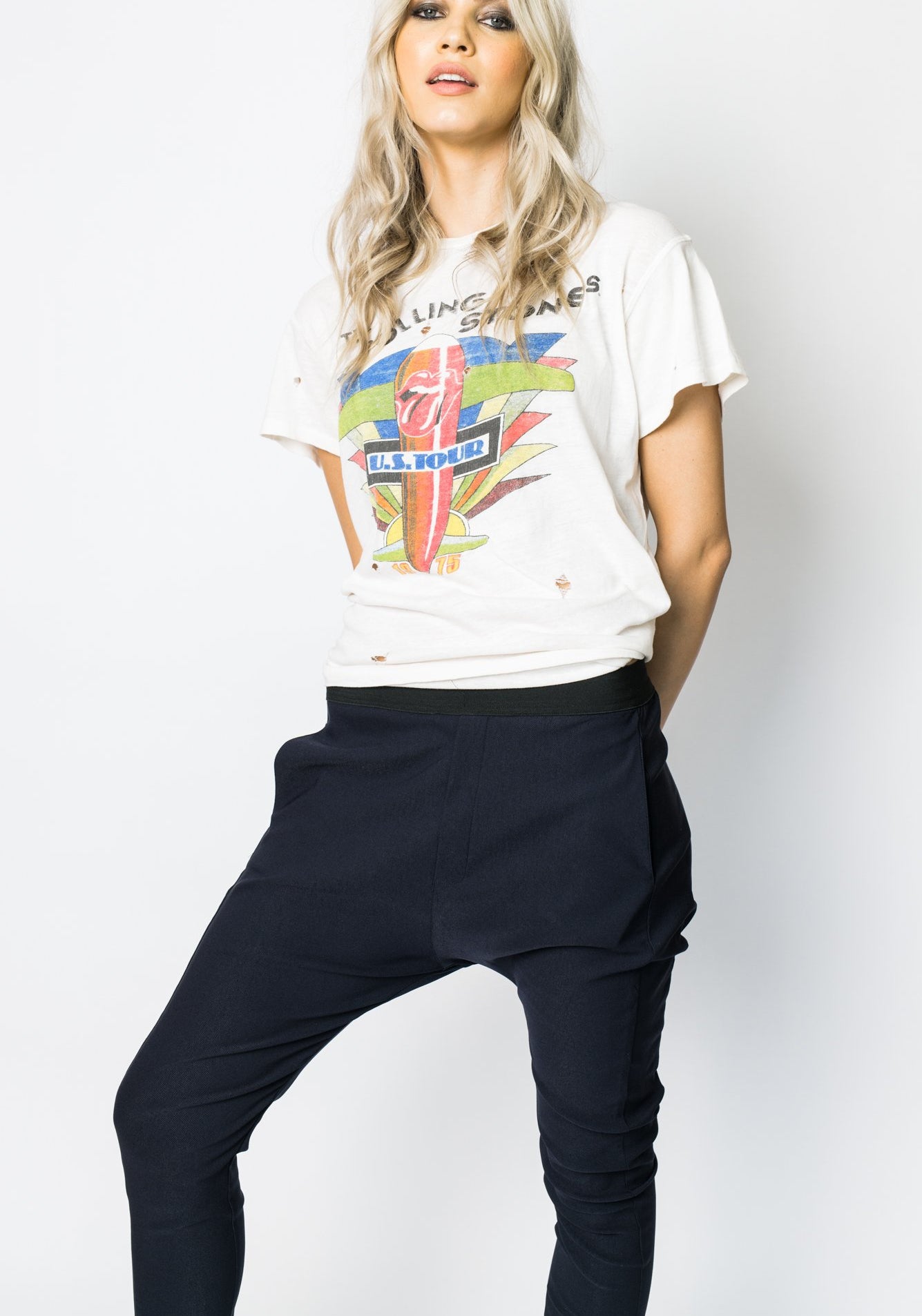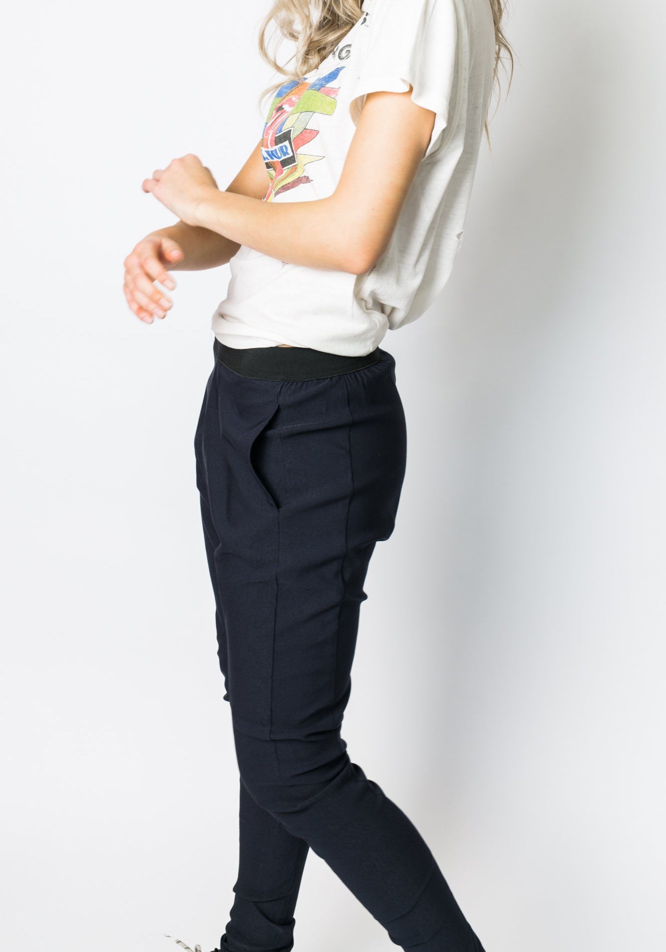 The Twill Trainer is a relaxed fit, pull-on stretch pant with a drop crotch that tapers into a slim leg. This easy fit, easy to wear pant features a soft Italian elastic waistband, faux fly and side pocket detail.