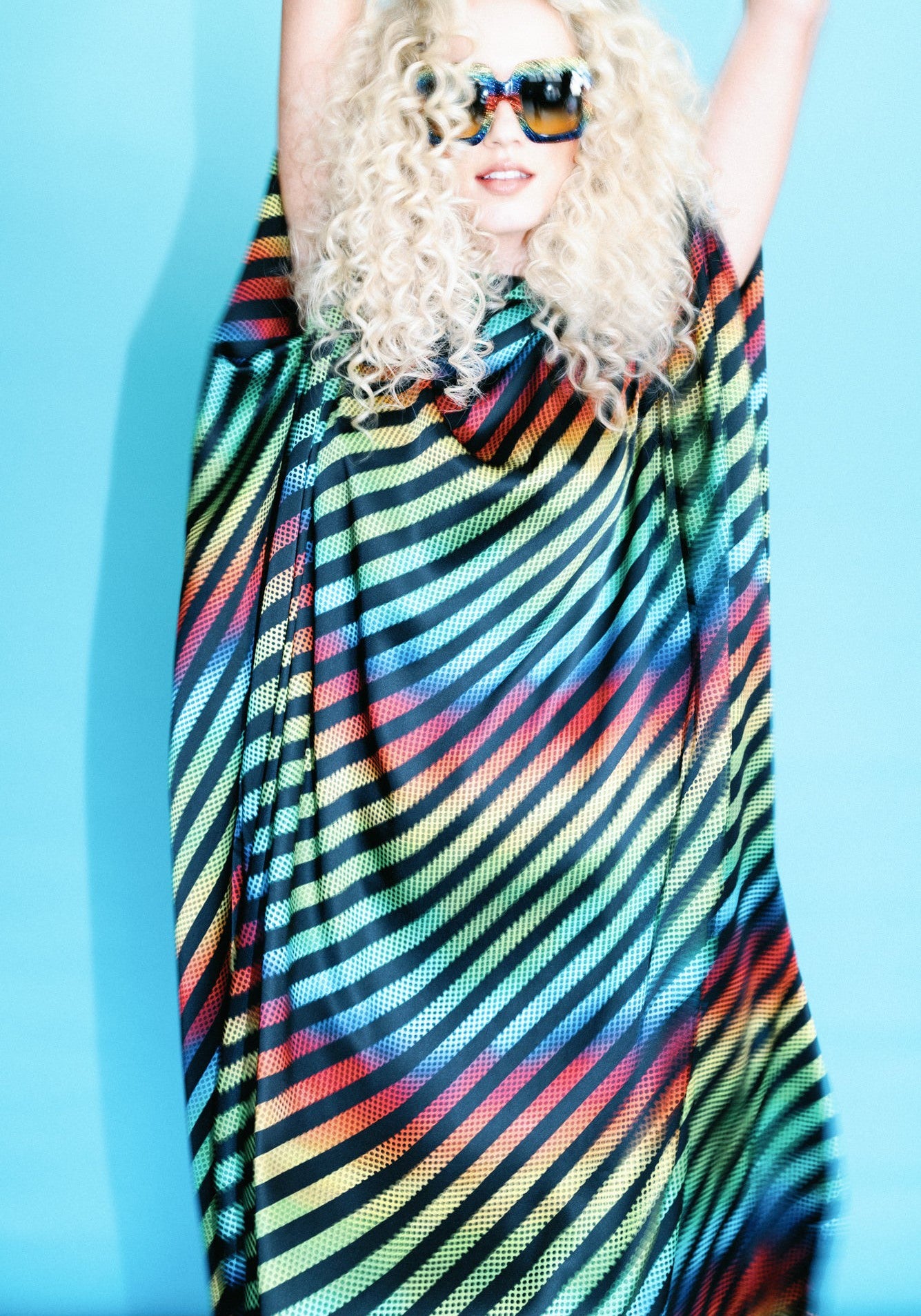 This luxurious silk satin sets stripes and spots against a kaleidoscope of brights in a stunning vibrant 70’s inspired Disco print.